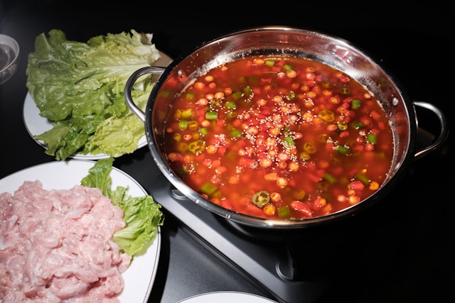 - 모든 재료가 잘 익고 국물이 진하게 우러나면, 마라탕을 불에서 내립니다.